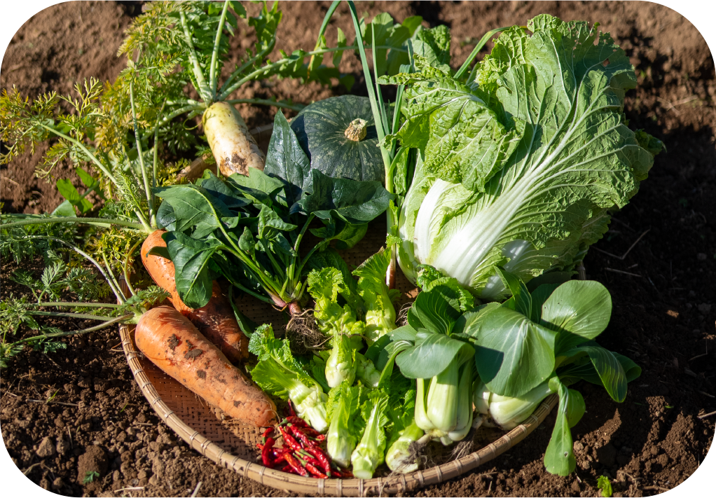 自社製造の天然由来の活性剤とろ過器を通した活性水、有機肥料を使用し、草を手で引き、心を込めて生産した野菜は元気に早く美味しく育ちます。